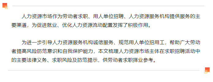 為進一步引導(dǎo)人力資源服務(wù)機構(gòu)誠信服務(wù)、規(guī)范用人單位招用工,幫助廣大勞動者提高風險防范意識和自我保護能力,本文梳理人力資源市場主體在求職招聘活動中的主要法律義務(wù)、求職風險及防范提示,供勞動者求職擇業(yè)參考。