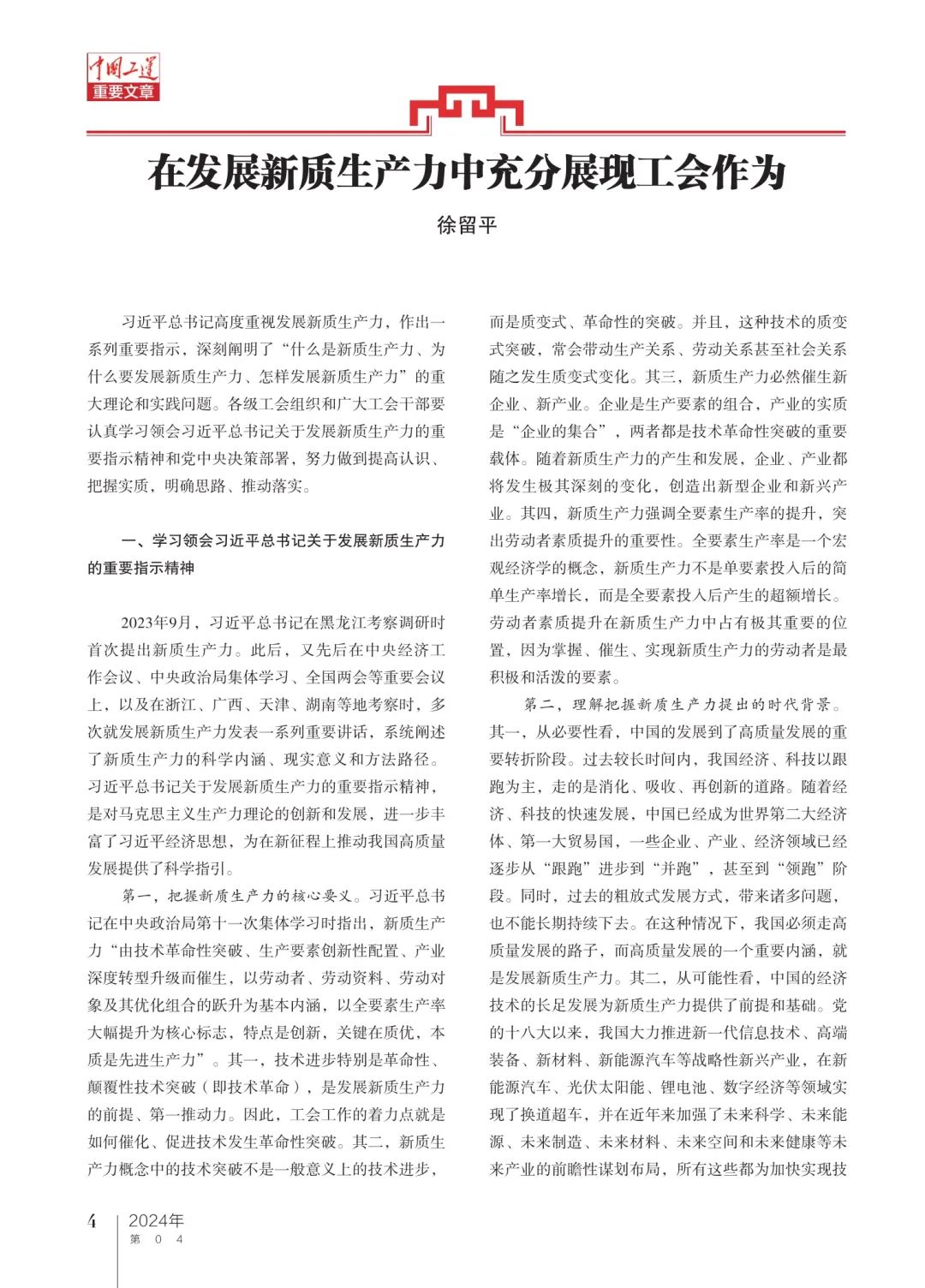 徐留平:在發(fā)展新質生產(chǎn)力中充分展現(xiàn)工會作為