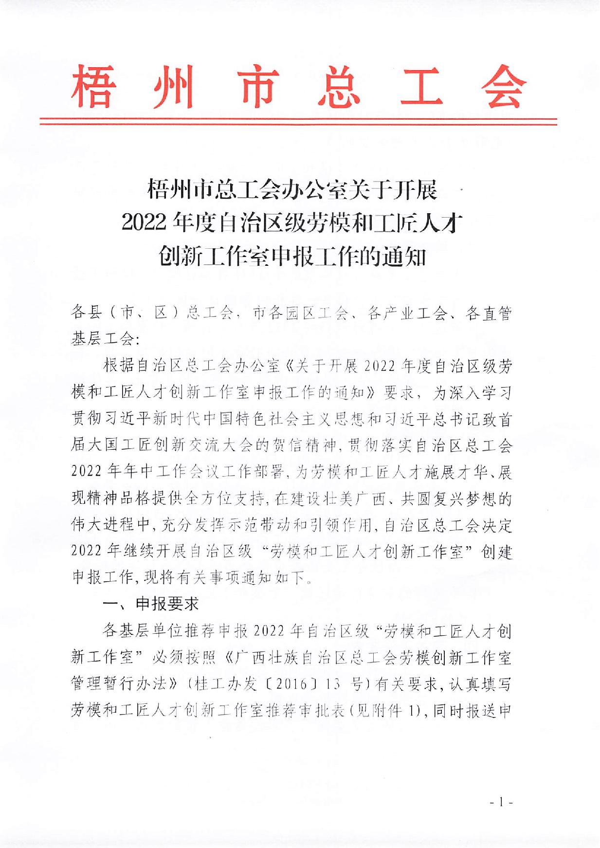 梧州市總工會(huì)辦公室關(guān)于開展2022年度自治區(qū)級(jí)勞模和工匠人才創(chuàng)新工作室申報(bào)工作的通知